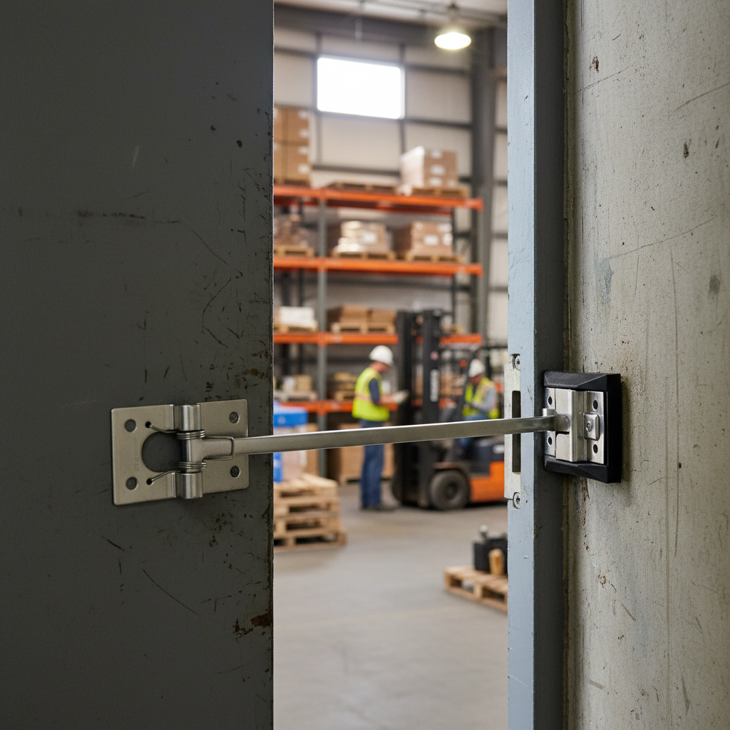 Stainless steel hooking door retainer with spring bridge T piece retainer and plastic back plate. Dimensions shown in pictures.