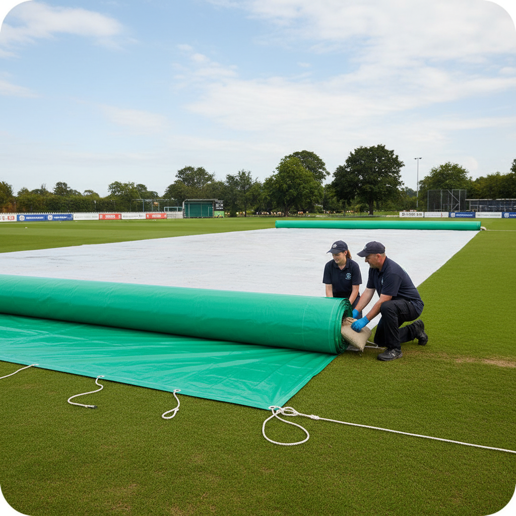 The cover weighs 250 gsm, providing a sturdy and durable option for cricket field maintenance.