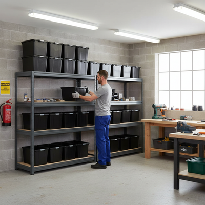 - Robust, sturdy heavy duty shelving units with strong, long-lasting storage boxes