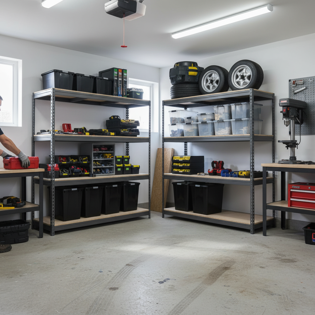 - Four heavy duty shelving units with tough, durable storage boxes.