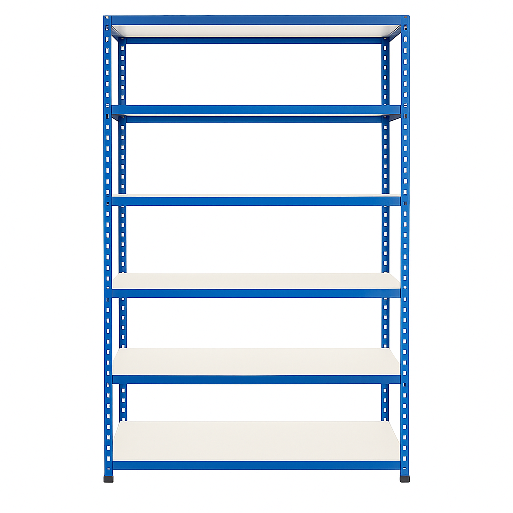Our shelving rack delivers on all fronts: a robust powder-coated steel frame finished in Blue uprights and Orange beams (brand-recognised combination), fully adjustable shelving slots every 38 mm, and a choice of board materials (chipboard, melamine or steel) so you can match your usage and environment.