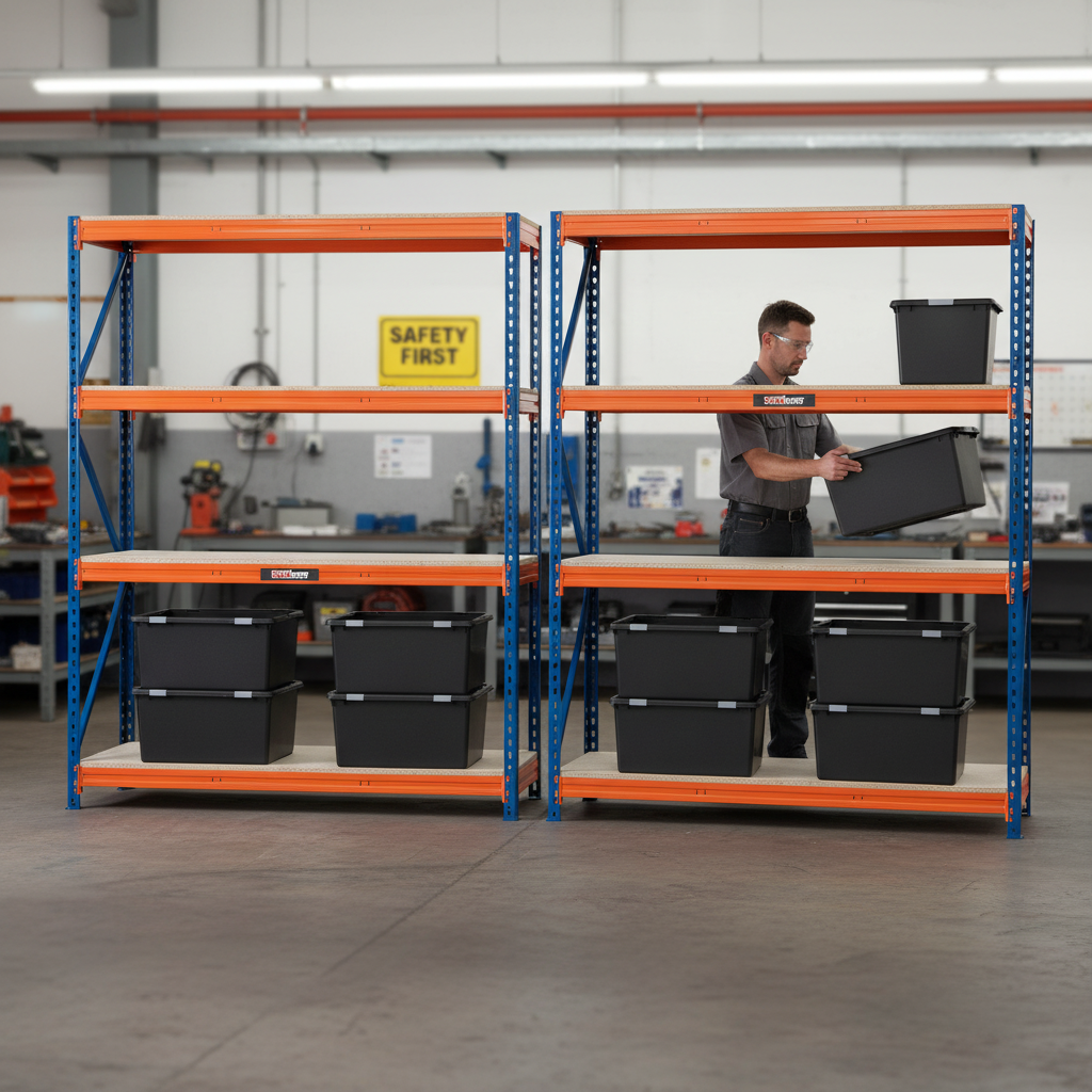 - Two robust heavy duty shelving units with strong, durable storage boxes.