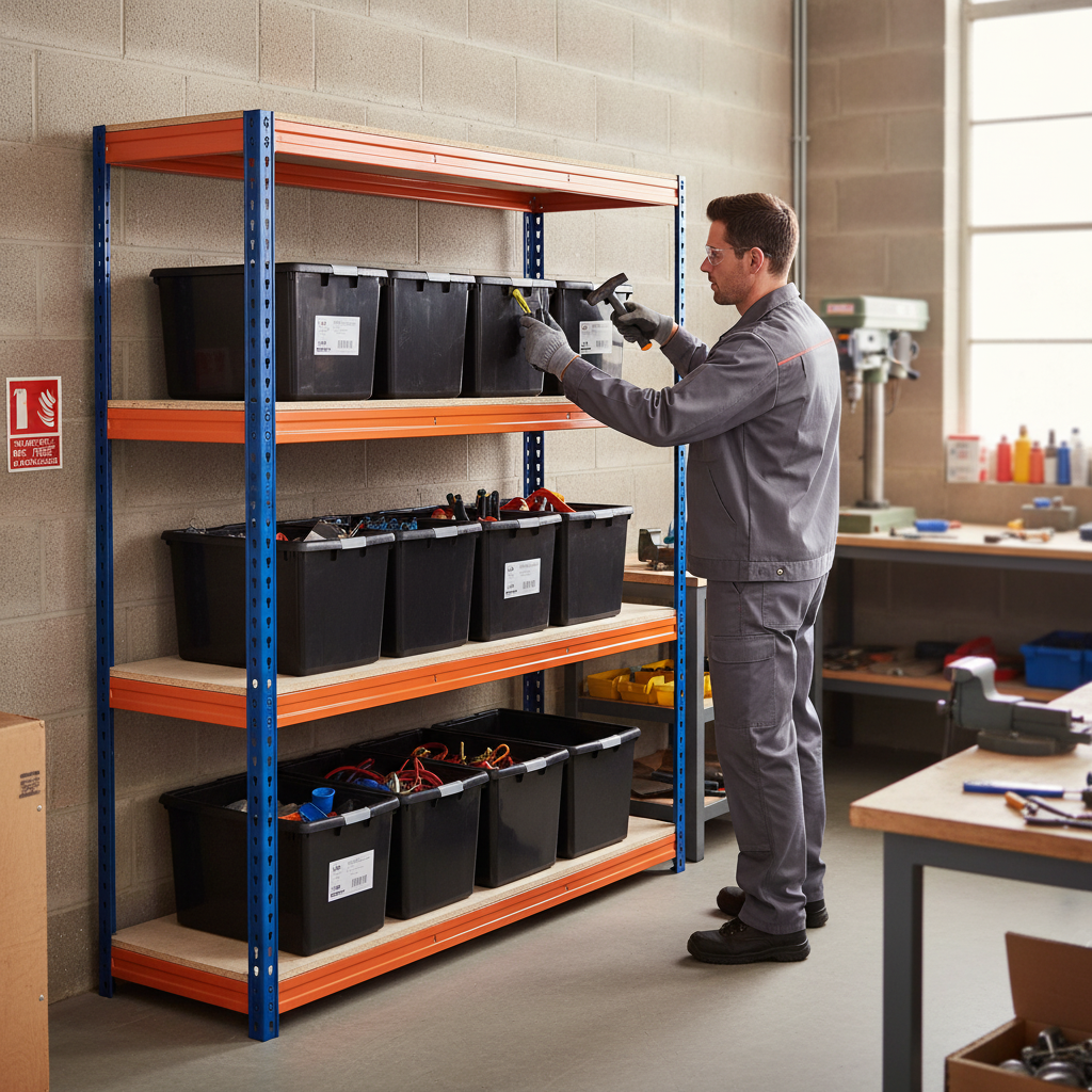 - Heavy duty shelving with strong, long-lasting storage boxes