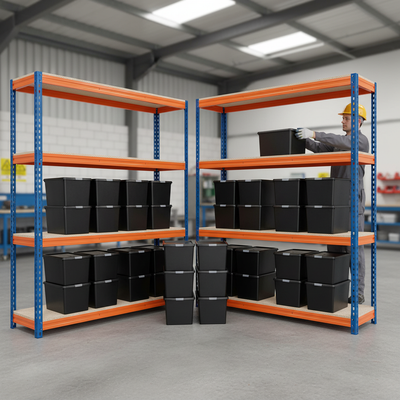 - Two heavy duty shelving units with strong, robust storage boxes
