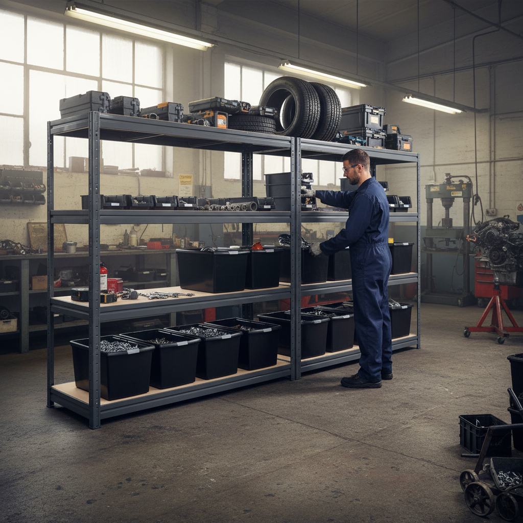 - Two of our industrial grade heavy duty shelving with robust DIY storage boxes.