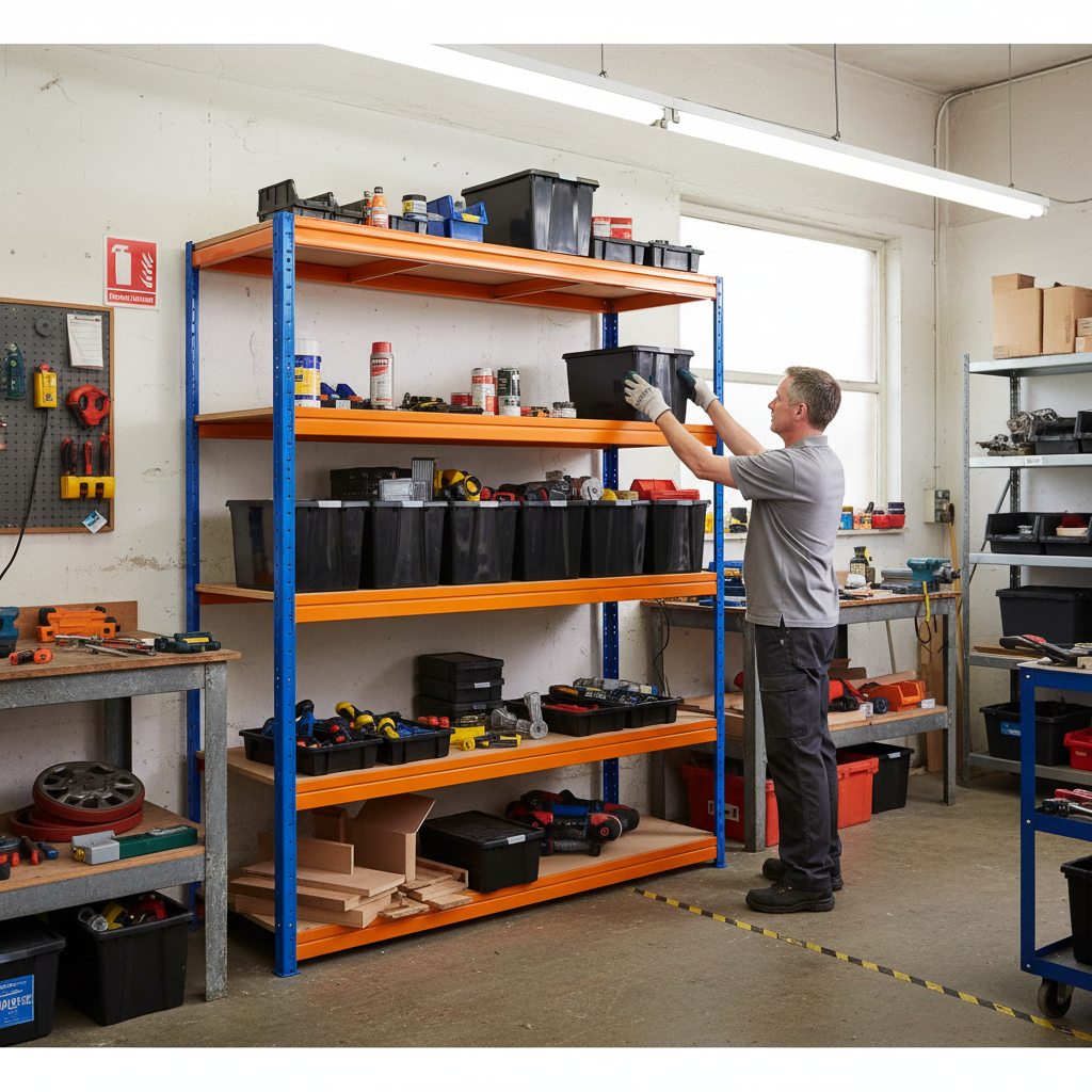 • Industrial grade heavy duty shelving with robust plastic storage boxes.