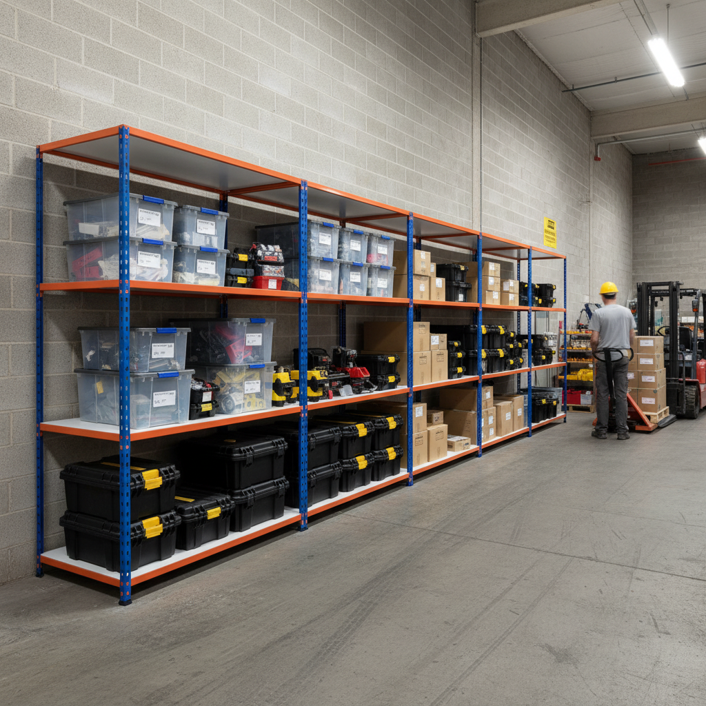 Premium 4x Industrial Shelving - 2440mm High - 340kg Capacity - Melamine - Blue & Orange